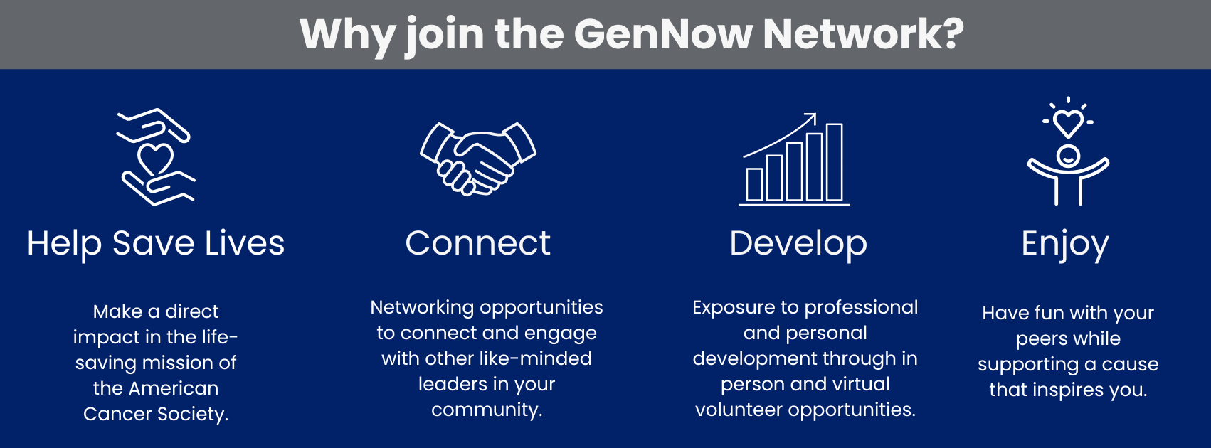 We are proud of the work we have made possible in the Palm Beach community since initiating our efforts in 2021. Our GenNow Network Palm Beach chapter is made up of members who are all support the American Cancer Society’s vision to end cancer as we know it, for everyone. With over $150,000 over the last 3 years we have been able to support the mission of the American Cancer Society and make a difference in the fight against cancer.
